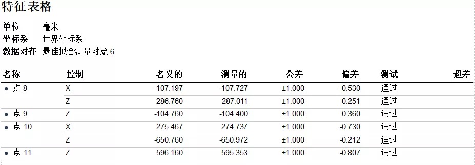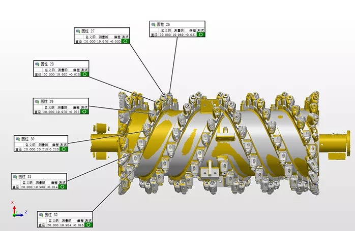 利用銑刨鼓兩端面、筒身特征約束XYZ平移自由度;點8、9、10、11四點約束YZ方向旋轉自由度。最后將掃描數據與CAD數模實現完全約束。(點8、9、10、11的單點偏差分別如下圖所示)